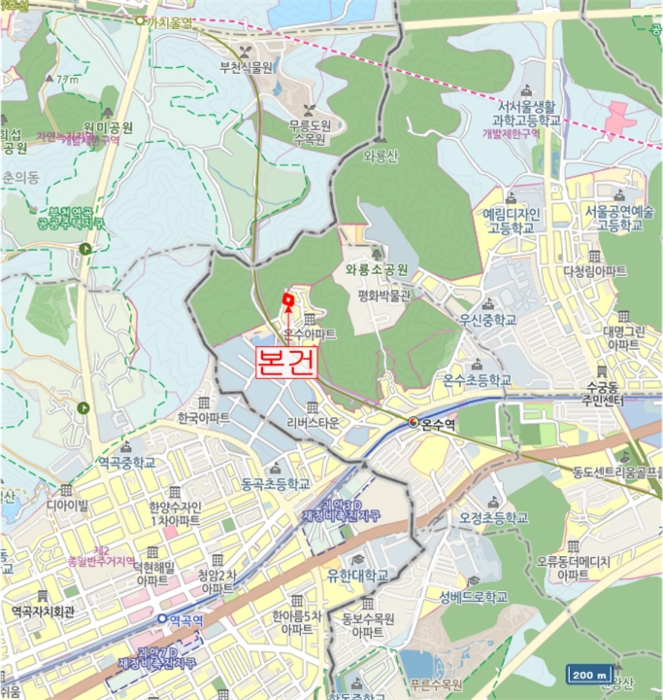 1) À§Ä¡ ¹× ÁÖÀ§È¯°æ=º»°ÇÀº ¼¿ïƯº°½Ã ±¸·Î±¸ ¿Â¼öµ¿ ¼ÒÀç ÁöÇÏö "¿Â¼ö¿ª" ºÏ¼Ãø Àαٿ¡ À§Ä¡Çϸç, ÁÖÀ§´Â ´Ù¼¼´ëÁÖÅÃ, ´Ù°¡±¸ÁÖÅÃ, ´Üµ¶ÁÖÅÃ, °øÀå, ¾ÆÆÄÆ® ¹× ±Ù¸°»ýȰ½Ã¼³ µîÀÌ È¥ÀçÇÏ´Â Áö´ë·Î¼, Àü¹ÝÀûÀÎ ÁÖÀ§È¯°æÀº º¸ÅëÀÓ.