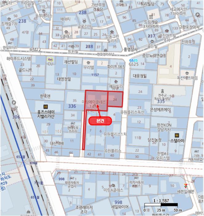 º»°Ç µ¿ÃøÀ¸·Î ¾à 8m³»¿Ü, ³²ÃøÀ¸·Î ¾à 20m³»¿ÜÀÇ Æ÷Àåµµ·Î¿¡ °¢°¢ Á¢ÇÔ.