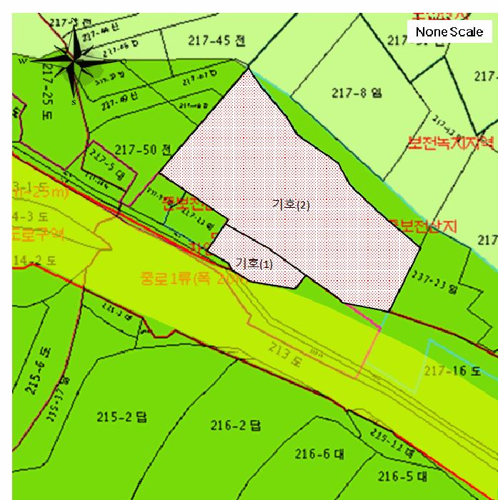 ±âÈ£(1): ÀÚ¿¬³ìÁöÁö¿ª, ÀÚ¿¬Ãë¶ôÁö±¸(´ë»ç°ñ), Áß·Î1·ù(Æø 20m~25m)(Áß·Î1-55)(Á¢ÇÕ), °¡Ãà »çÀ°Á¦Çѱ¸¿ª(¸ðµçÃàÁ¾ Á¦ÇÑ)<°¡ÃàºÐ´¢ÀÇ °ü¸® ¹× À̿뿡 °üÇÑ ¹ý·ü>. ±âÈ£(2): º¸Àü³ìÁöÁö¿ª, ÀÚ¿¬³ìÁöÁö¿ª, Áß·Î1·ù(Æø 20m~25m)(Áß·Î1-55)(Á¢ÇÕ), °¡Ãà»çÀ°Á¦ÇÑ ±¸¿ª(¸ðµçÃàÁ¾ Á¦ÇÑ)<°¡ÃàºÐ´¢ÀÇ °ü¸® ¹× À̿뿡 °üÇÑ ¹ý·ü>.