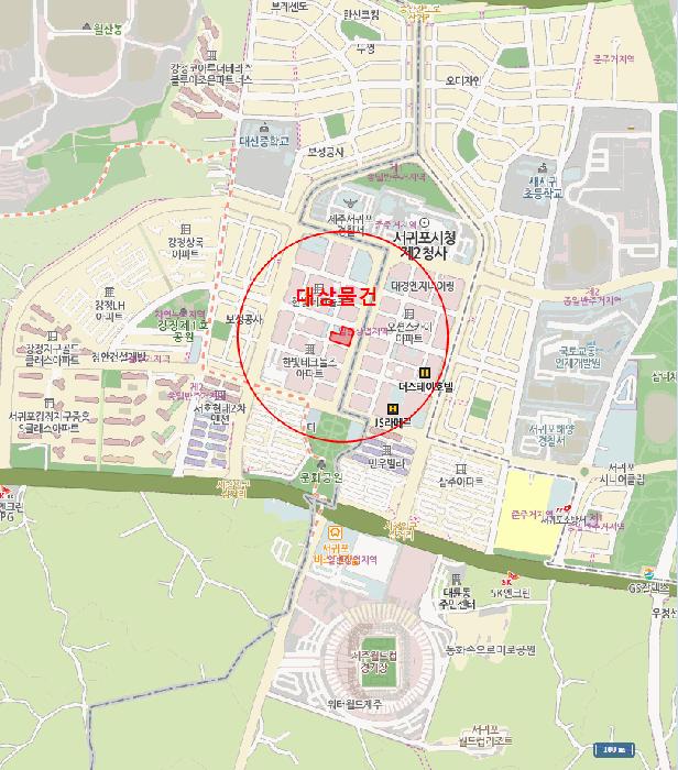 ´ë»ó¹°°ÇÀº 3ÇÊ ÀÏ´ÜÀÇ ÅäÁö·Î¼, ÁöÀûµµ»ó ³²µ¿Ãø, ºÏµ¿Ãø, ºÏ¼Ãø ¹× ³²¼ÃøÀ¸·Î Æø ¾à 40M, 15M, 8M ¹× 7M ³»¿ÜÀÇ ¾Æ½ºÆÈÆ®Æ÷Àåµµ·Î¿¡ °¢°¢ Á¢ÇÔ.