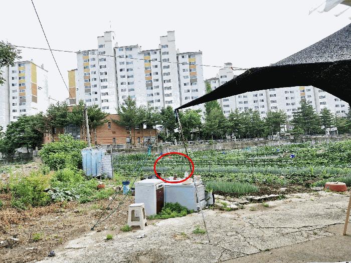 º°Ã· »çÁø°ú °°ÀÌ º»°Ç ºÏÃø °æ°èºÎºÐ¿¡ ¼ÒÀ¯ÀÚ ¹Ì»óÀÇ Á¦½Ã¿Ü °Ç¹°(¼¼¸àºê·°Á¶ õ¸·ÁöºØ ¾à 70§³ ÁÖ°Å¿ë)ÀÇ ÀϺΰ¡ °ÉÃļ ¼ÒÀçÇÏ´Â °ÍÀ¸·Î ¸ñÃøµÇ³ª, Á¤È®ÇÑ ¼ÒÀç¿©ºÎ´Â Ãø·®À» ¿äÇÔ.